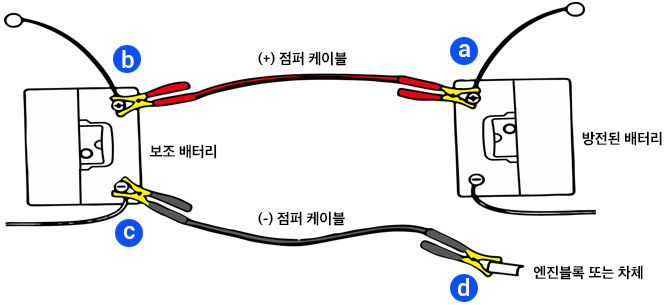 점퍼 케이블을 연결하기 전에 두 배터리를 모두 검사하고 손상된 배터리의 경우 점퍼 시동하지 마십시오.